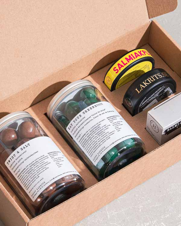 Geschenkbox mit Twist & Salt, Eat Your Greens, Salmiakpulver, Lakritzboot und Salmiakbombe